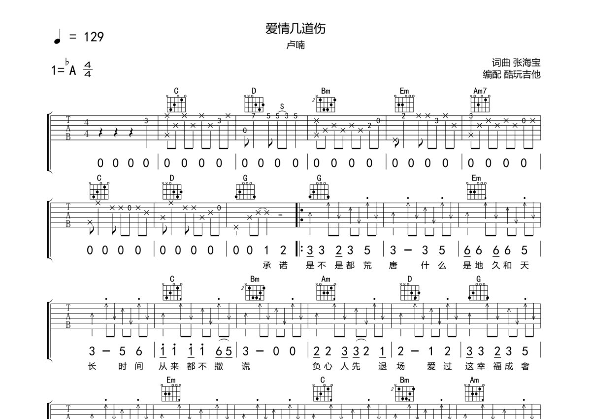 卢喃《爱情几道伤》吉他谱 - G调弹唱六线谱