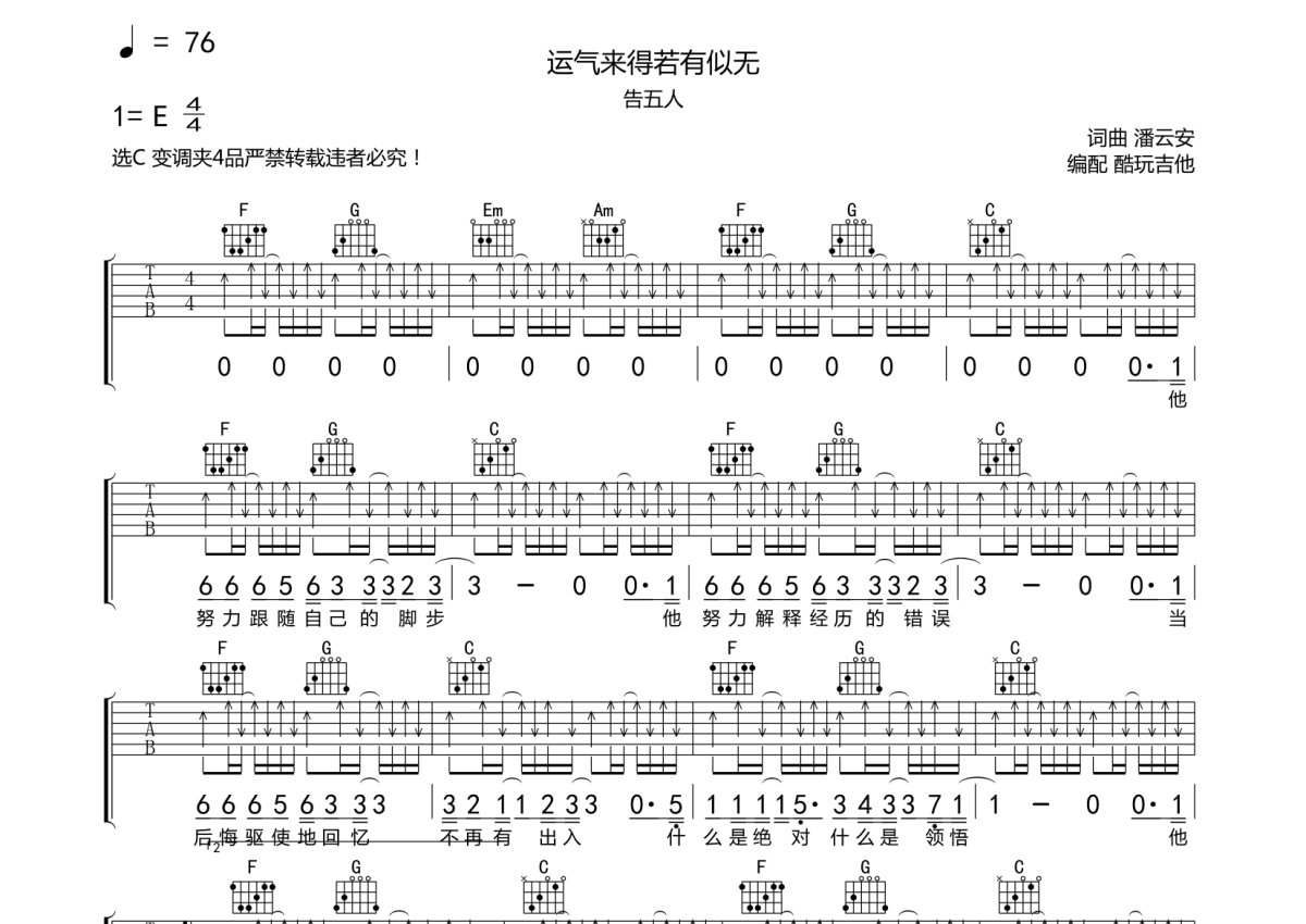 告五人《运气来的若有似无》吉他谱 - C调弹唱六线谱