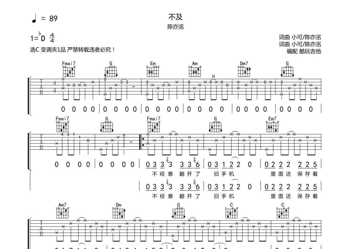 陈亦洺《不及》吉他谱 - C调弹唱六线谱