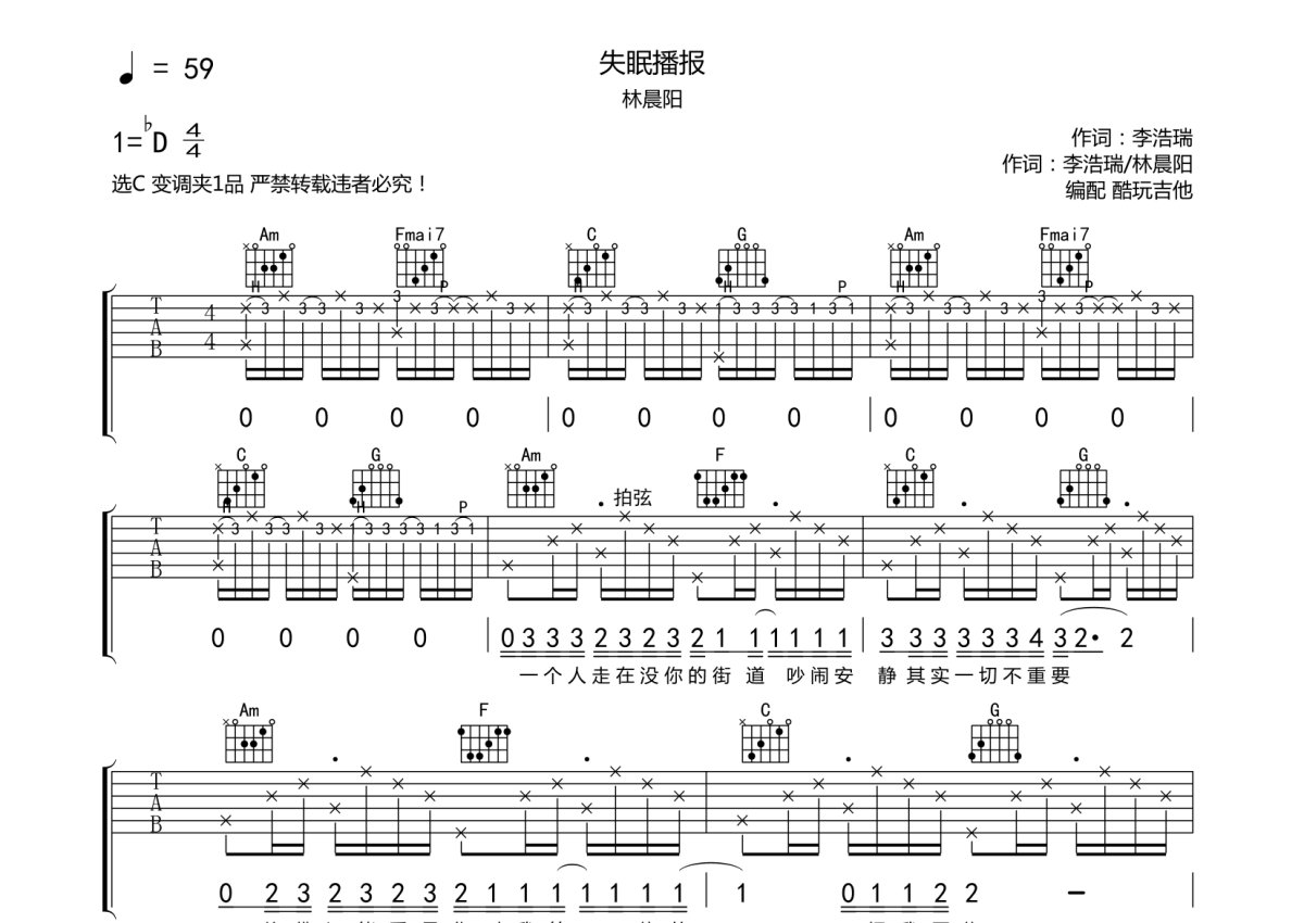 林晨阳《失眠播报》吉他谱 - C调弹唱六线谱