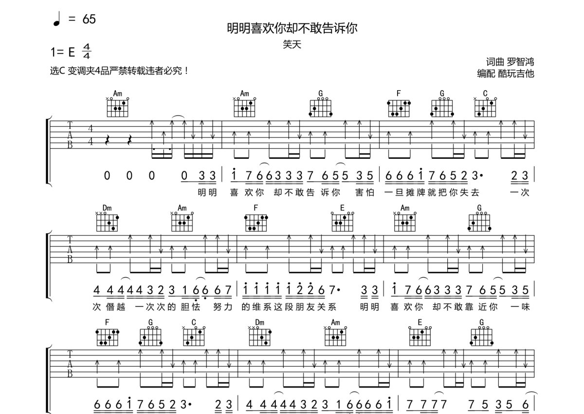 笑天《明明喜欢你却不敢告诉你》吉他谱 - C调弹唱六线谱
