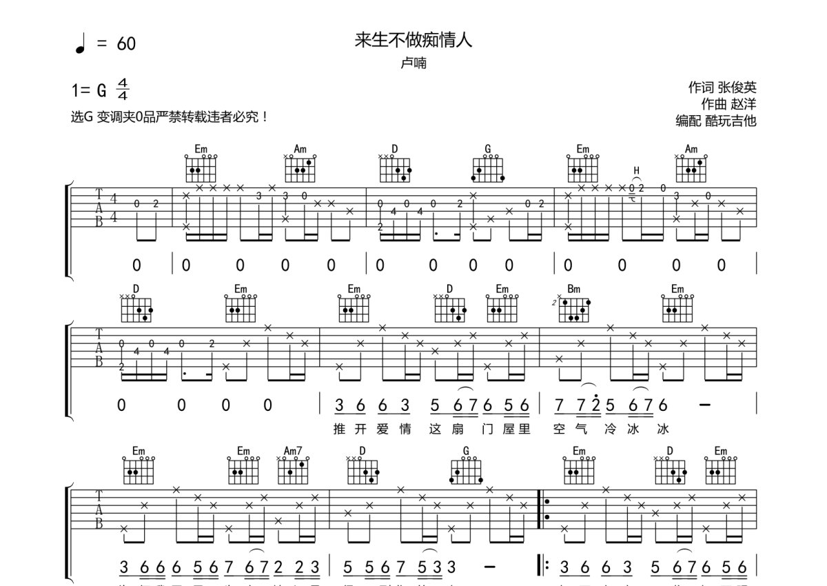 《来生不做痴情人》是卢喃演唱的一首歌曲,本吉他谱采用的是G调指法编配,这份吉他谱共有两张高清图谱,图谱由 @酷玩吉他 编配上传,图谱使用六线谱编配,包含吉他和弦指法、简谱以及歌词部分,使用这份来生不做痴情人吉他谱,可以让你更加方便地掌握这首歌曲的弹唱技巧,快来尝试吧。卢喃《来生不做痴情人》吉他谱_G调吉他弹唱谱。