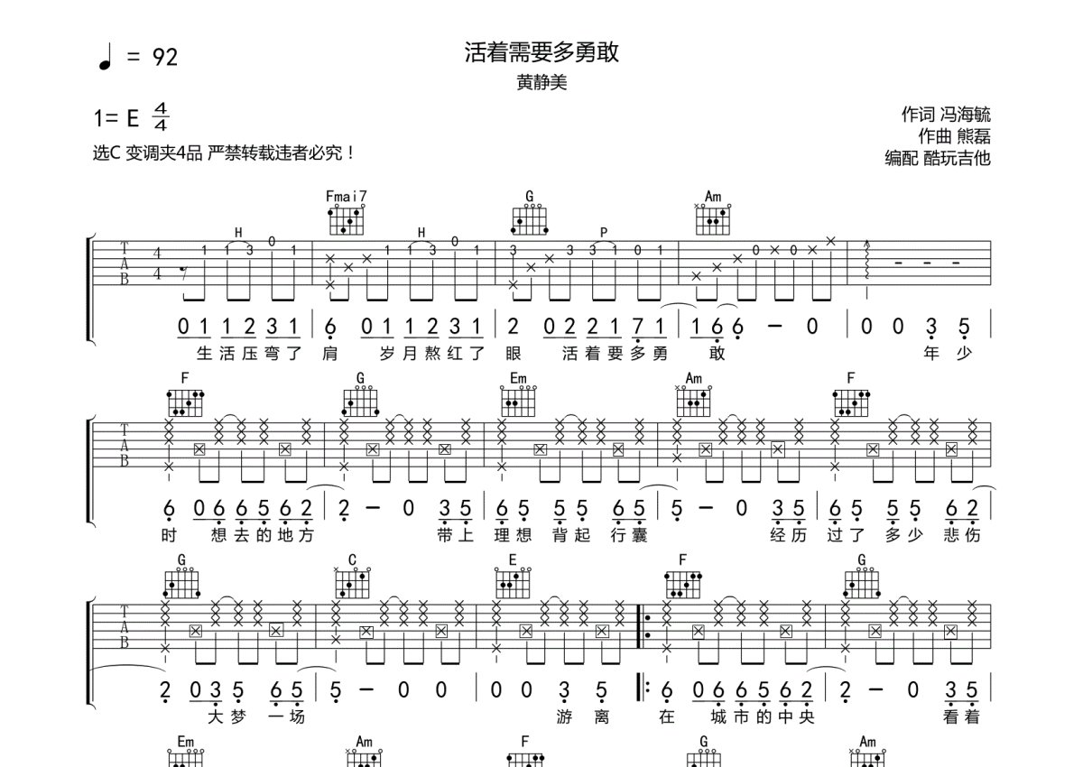 黄静美《活着需要多勇敢》吉他谱 - C调弹唱六线谱