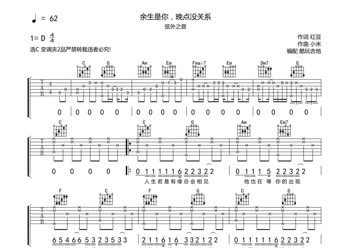 弦外之音《余生是你,晚点没关系》吉他谱 - C调弹唱六线谱