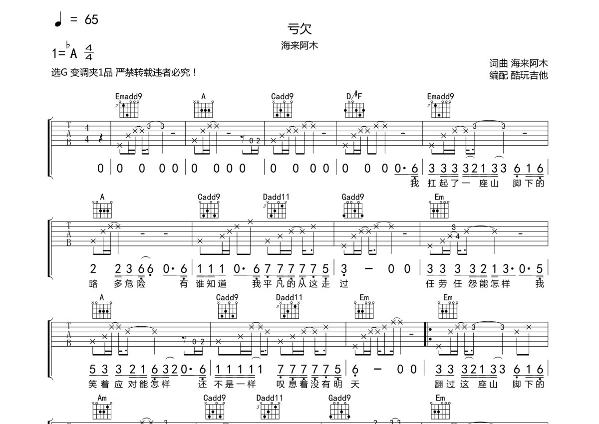 海来阿木《亏欠》吉他谱 - G调弹唱六线谱