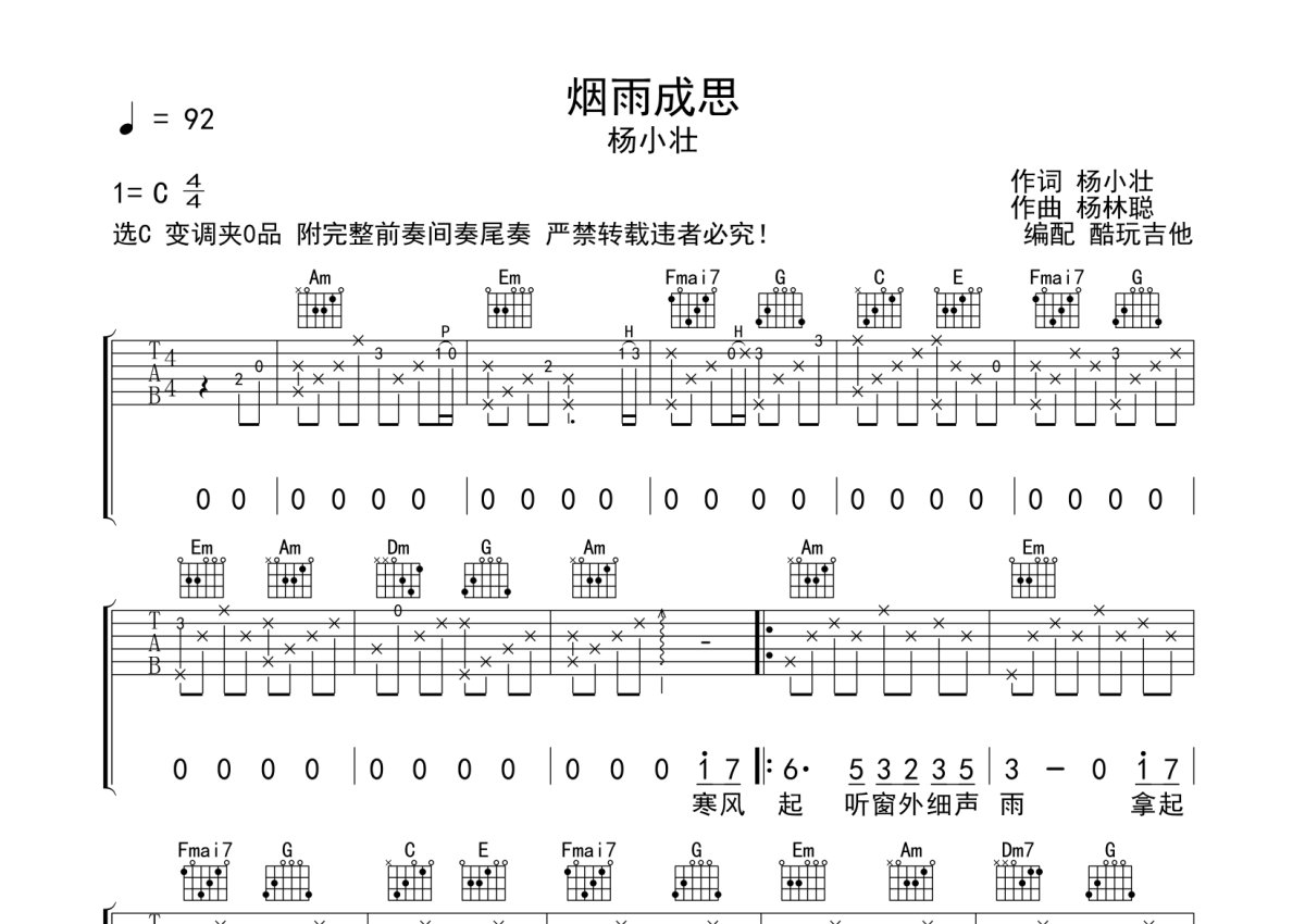 杨小壮《烟雨成思》吉他谱 - C调弹唱六线谱