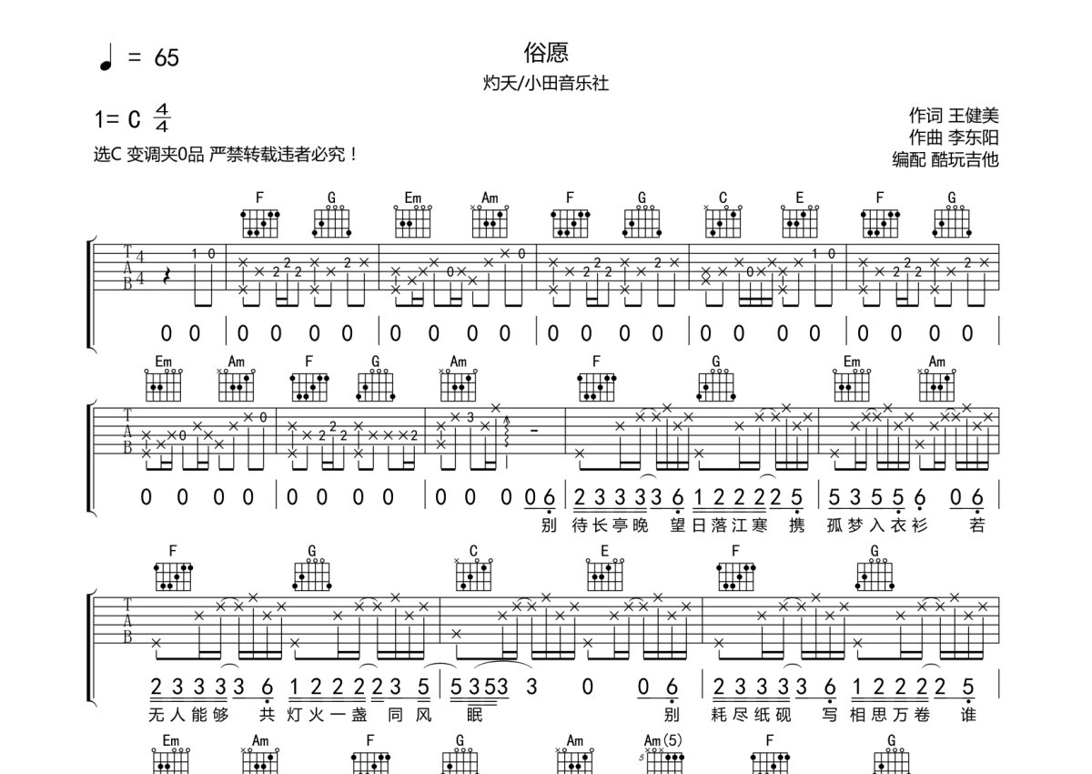 烁夭/小田音乐社《俗愿》吉他谱 - C调弹唱六线谱