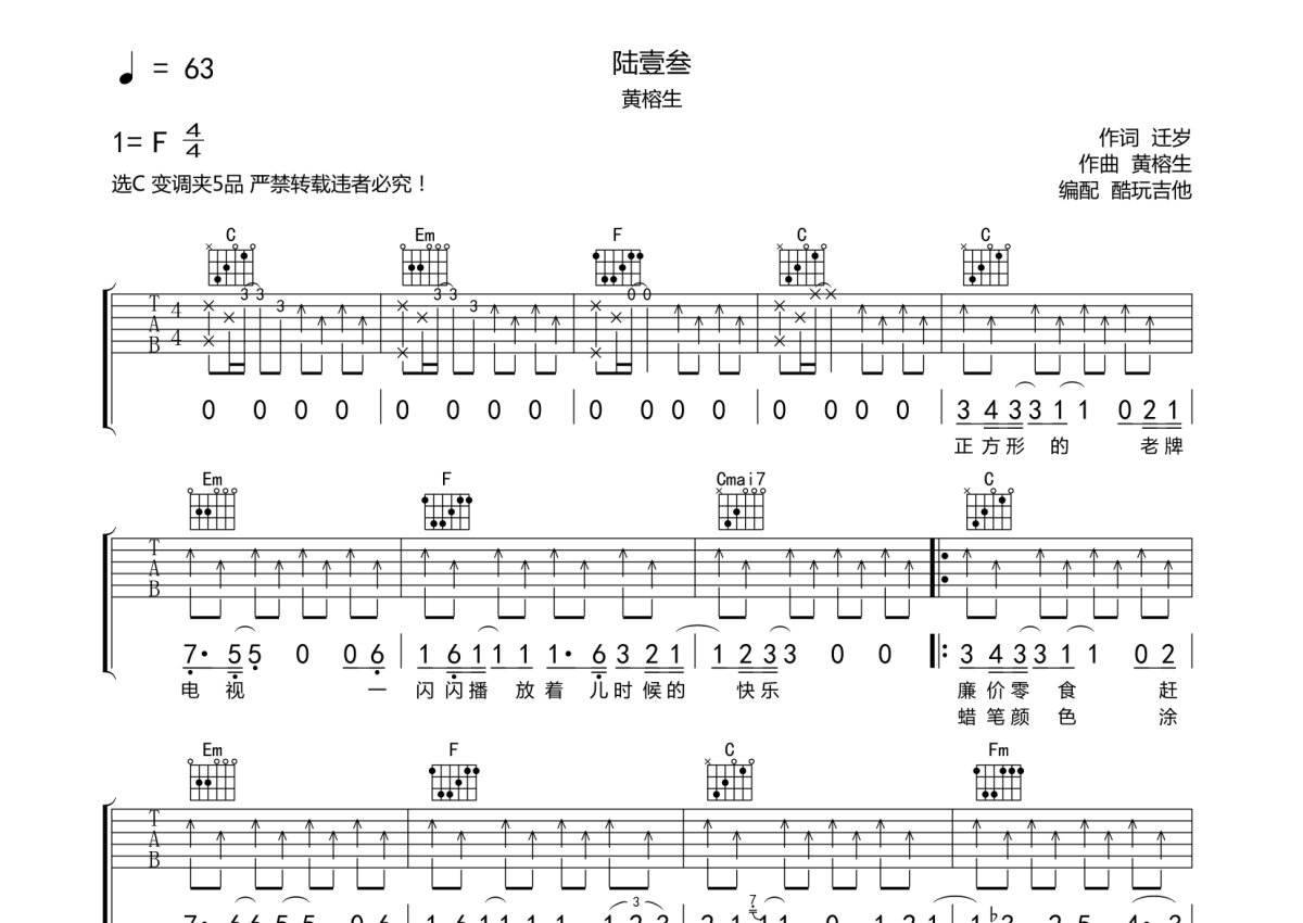 黄榕生《陆壹叁》吉他谱 - C调弹唱六线谱