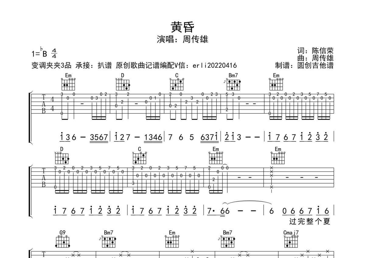 《黄昏》是周传雄演唱的一首歌曲,分解加扫弦编配原版编配,本吉他谱采用的是G调指法编配,这份吉他谱共有两张高清图谱,图谱由 @圆创吉他谱 编配上传,图谱使用六线谱编配,包含吉他和弦指法、简谱以及歌词部分,使用这份黄昏吉他谱,可以让你更加方便地掌握这首歌曲的弹唱技巧,快来尝试吧。经典歌曲 G调指法编配 适合所以吉他弹出爱好者。