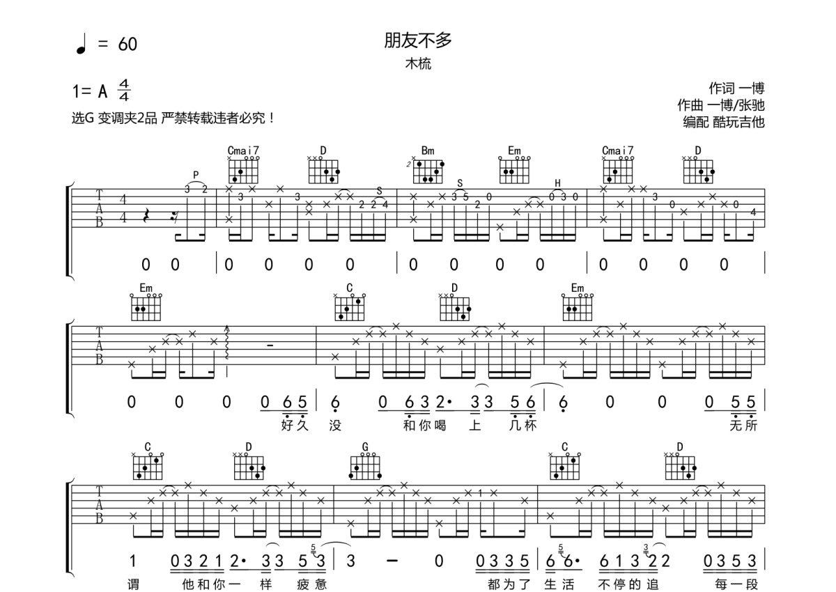 木梳《朋友不多》吉他谱 - G调弹唱六线谱