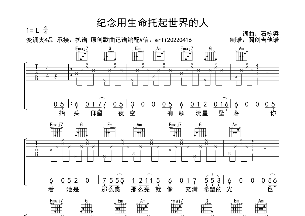 《纪念用生命拖起世界的人》是石栋梁演唱的一首歌曲,分解加扫弦编配简单编配,本吉他谱采用的是C调指法编配,这份吉他谱共有三张高清图谱,图谱由 @圆创吉他谱 编配上传,图谱使用六线谱编配,包含吉他和弦指法、简谱以及歌词部分,使用这份纪念用生命拖起世界的人吉他谱,可以让你更加方便地掌握这首歌曲的弹唱技巧,快来尝试吧。经典歌曲 C调指法编配 适合所有吉他弹出爱好者。