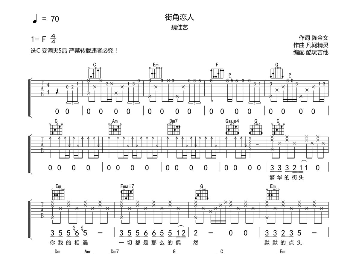 魏佳艺《街角恋人》吉他谱 - C调弹唱六线谱
