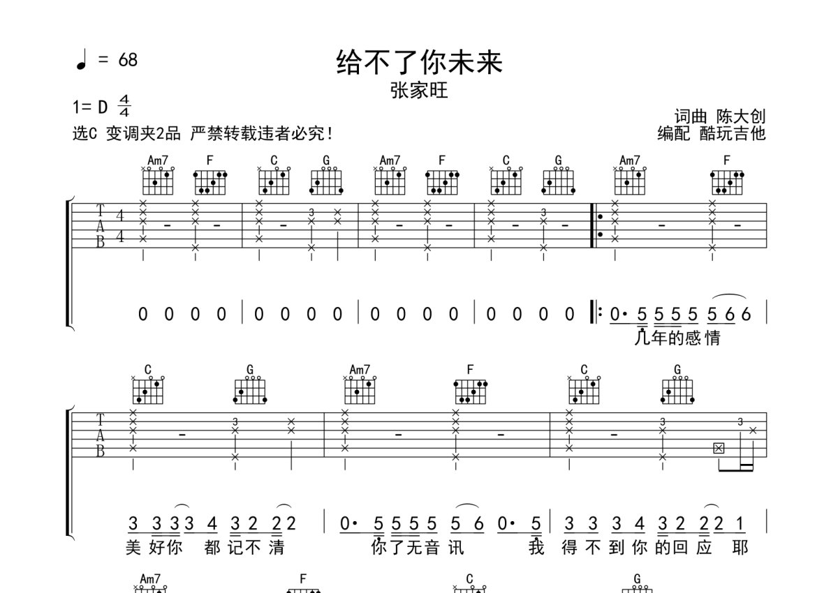 张家旺《给不了你未来》吉他谱 - C调弹唱六线谱