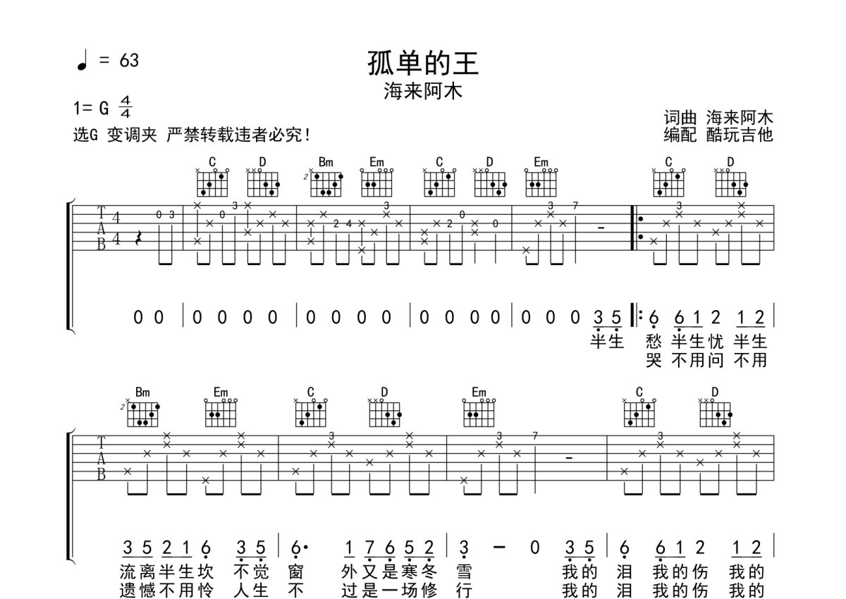 海来阿木《孤单的王》吉他谱 - G调弹唱六线谱