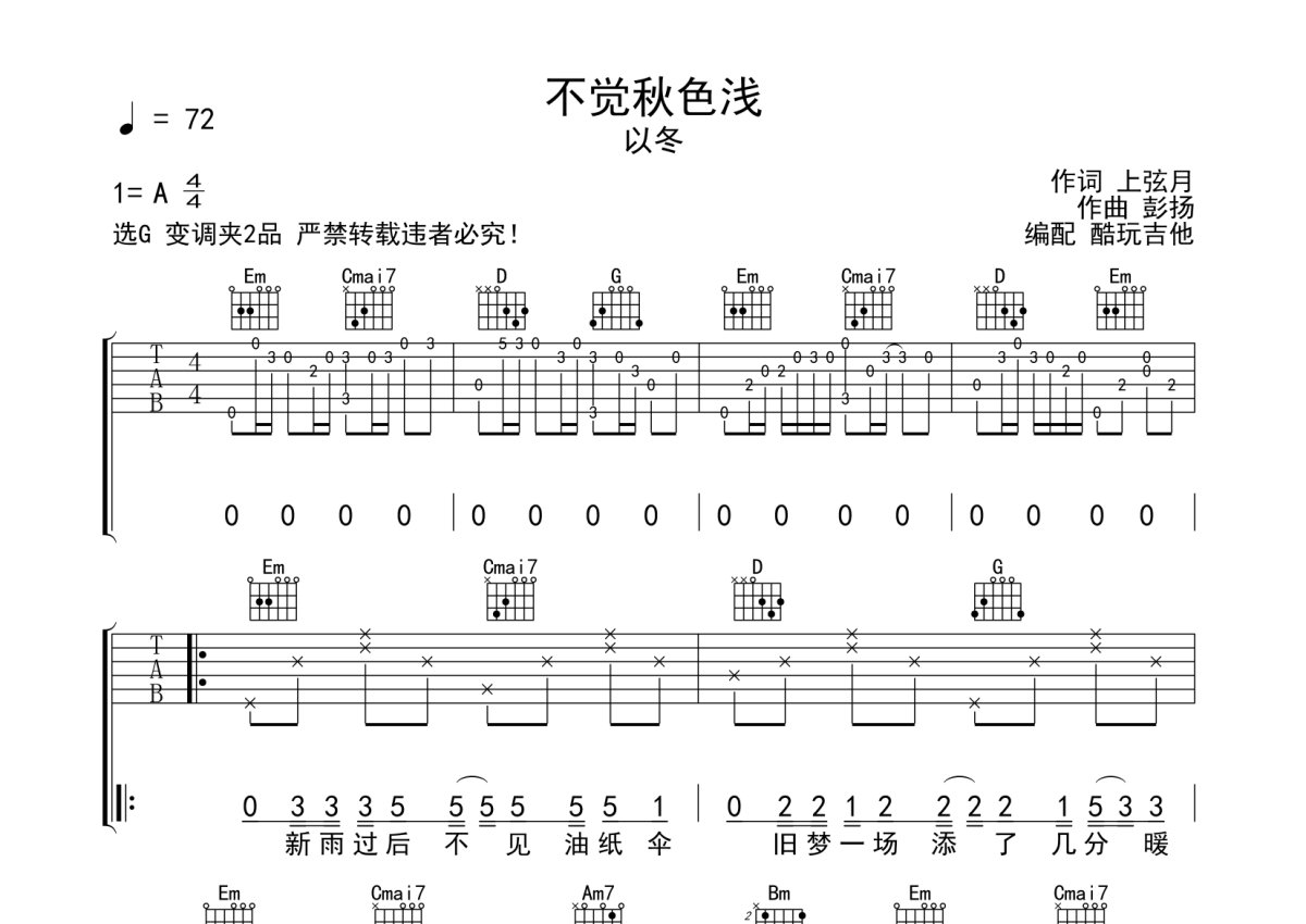 以冬《不觉秋色浅》吉他谱 - G调弹唱六线谱