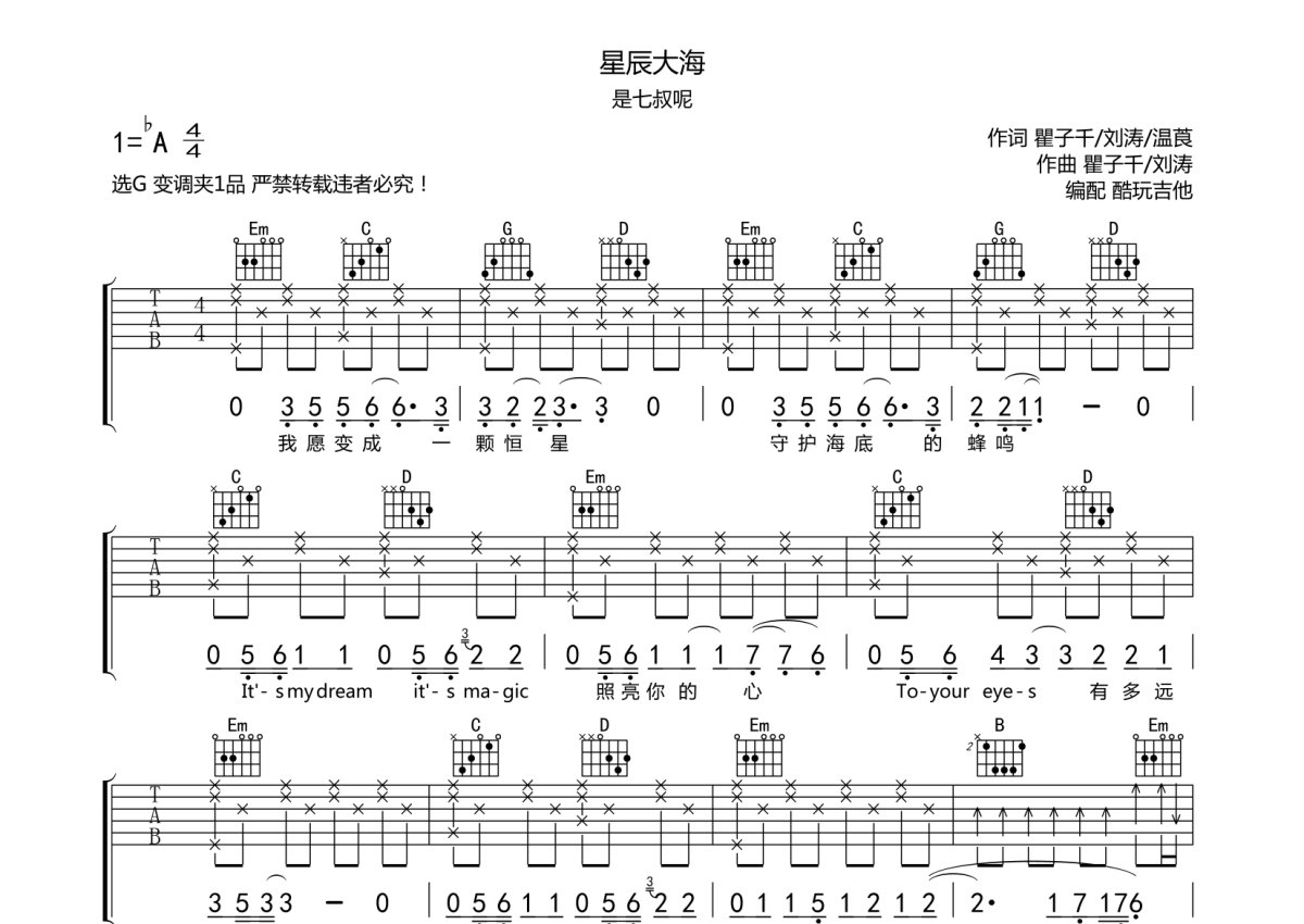 是七叔呢《星辰大海》吉他谱 - G调弹唱六线谱