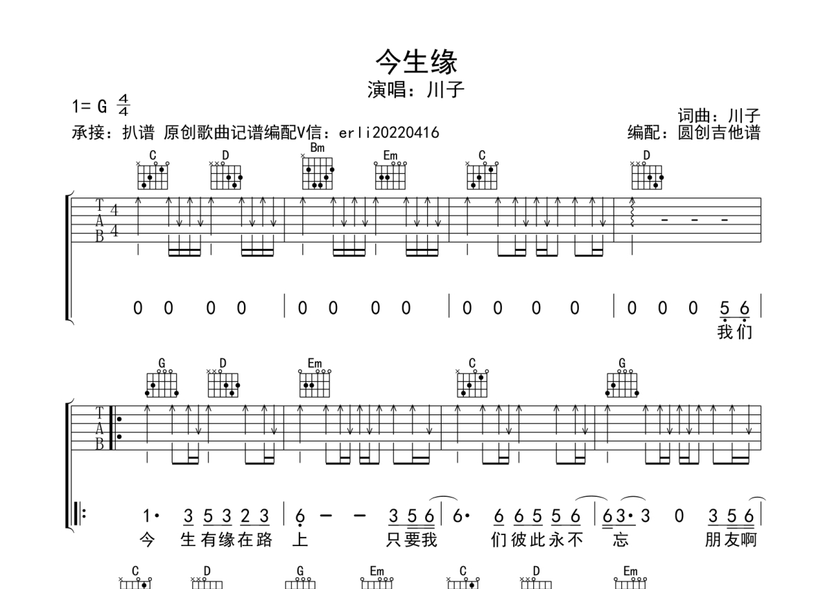 《今生缘》是今生缘演唱的一首歌曲,扫弦编配原版编配,本吉他谱采用的是G调指法编配,这份吉他谱共有三张高清图谱,图谱由 @圆创吉他谱 编配上传,图谱使用六线谱编配,包含吉他和弦指法、简谱以及歌词部分,使用这份今生缘吉他谱,可以让你更加方便地掌握这首歌曲的弹唱技巧,快来尝试吧。经典歌曲G调指法编配 适合所有吉他弹出爱好者。