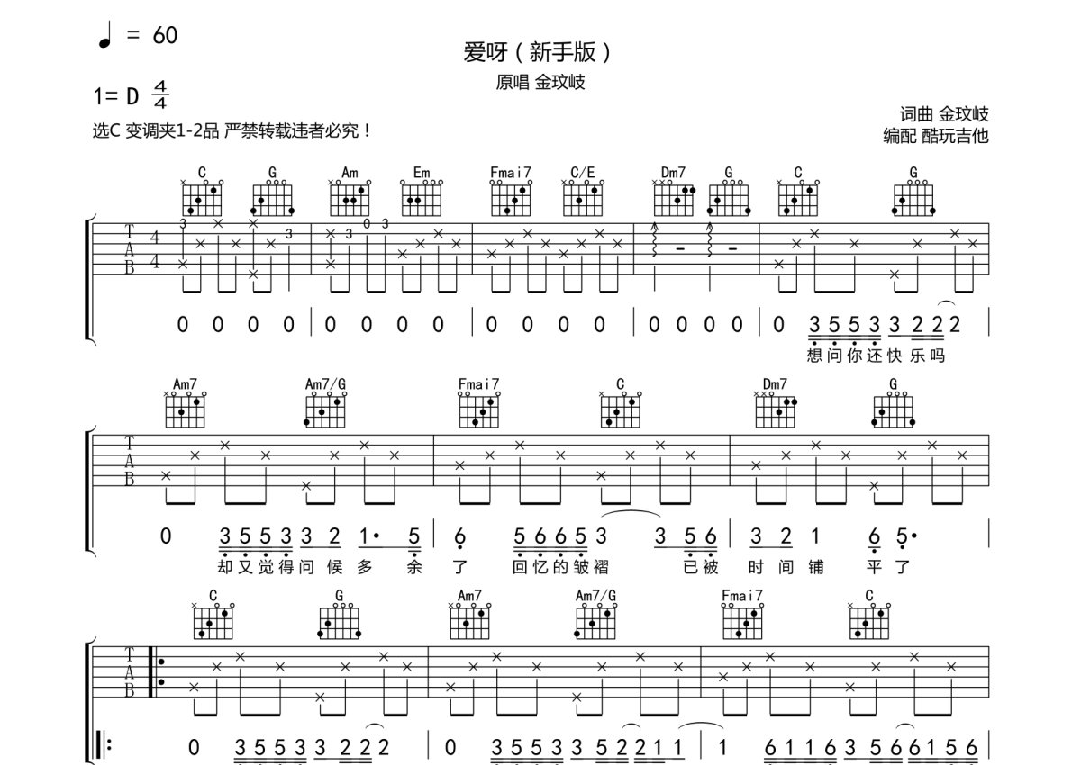 金歧文《爱呀》吉他谱 - C调弹唱六线谱
