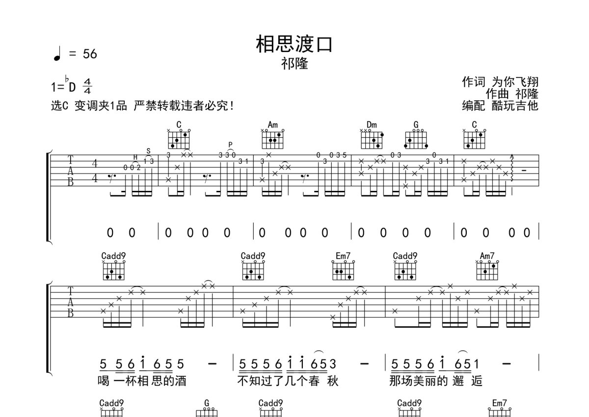 祁隆《相思渡口》吉他谱 - C调弹唱六线谱