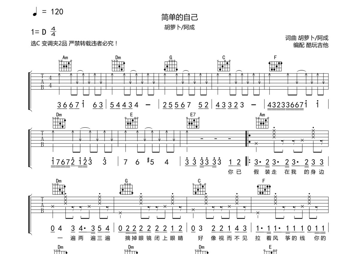 胡萝卜/阿成尹《简单的自己》吉他谱 - C调弹唱六线谱