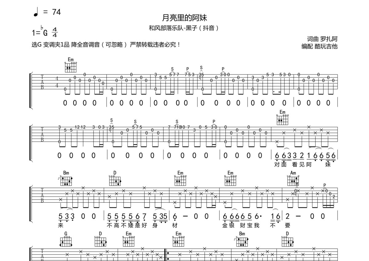 黑子《月亮里的阿妹》吉他谱 - G调弹唱六线谱
