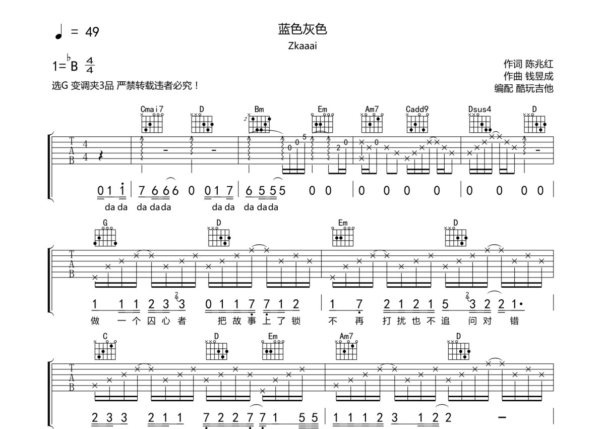 zkaaai《蓝色灰色》吉他谱 - G调弹唱六线谱