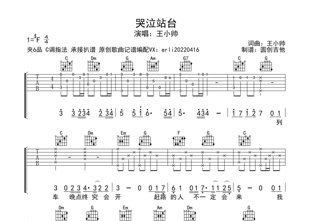 王小帅《哭泣站台》吉他谱 - C调弹唱六线谱 - 分解加扫弦节奏简单编配