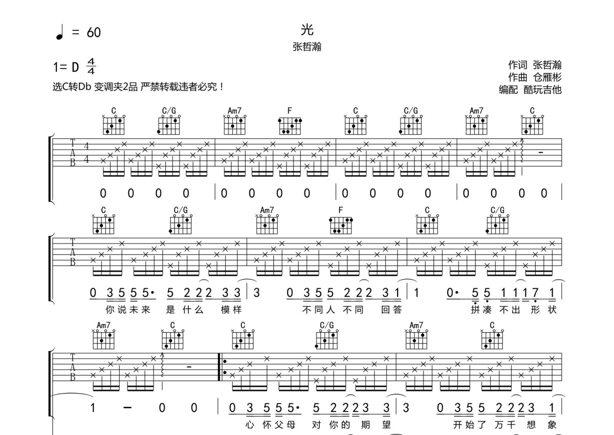 张哲瀚《光》吉他谱 - C调弹唱六线谱