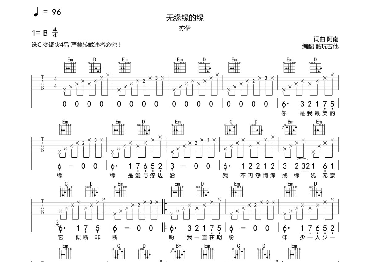 亦伊《无缘缘的缘》吉他谱 - C调弹唱六线谱