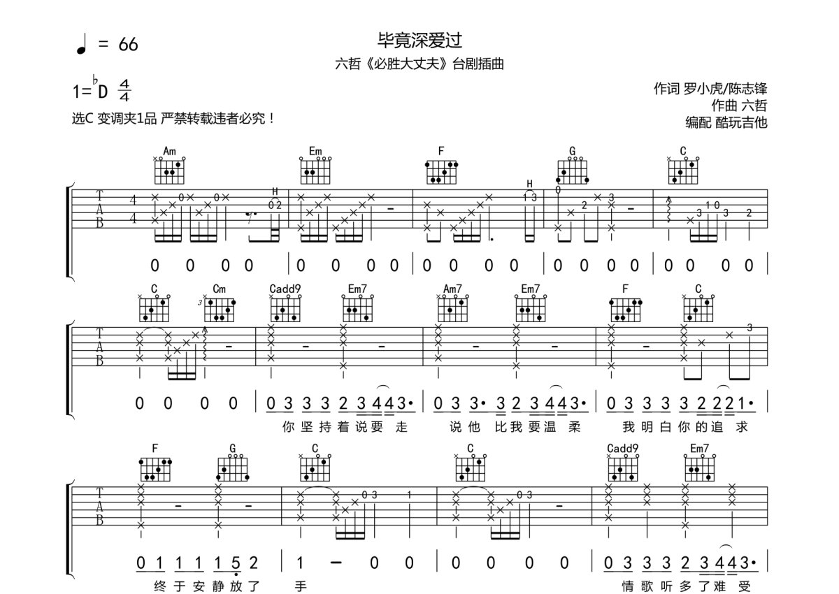 六哲《毕竟深爱过》吉他谱 - C调弹唱六线谱