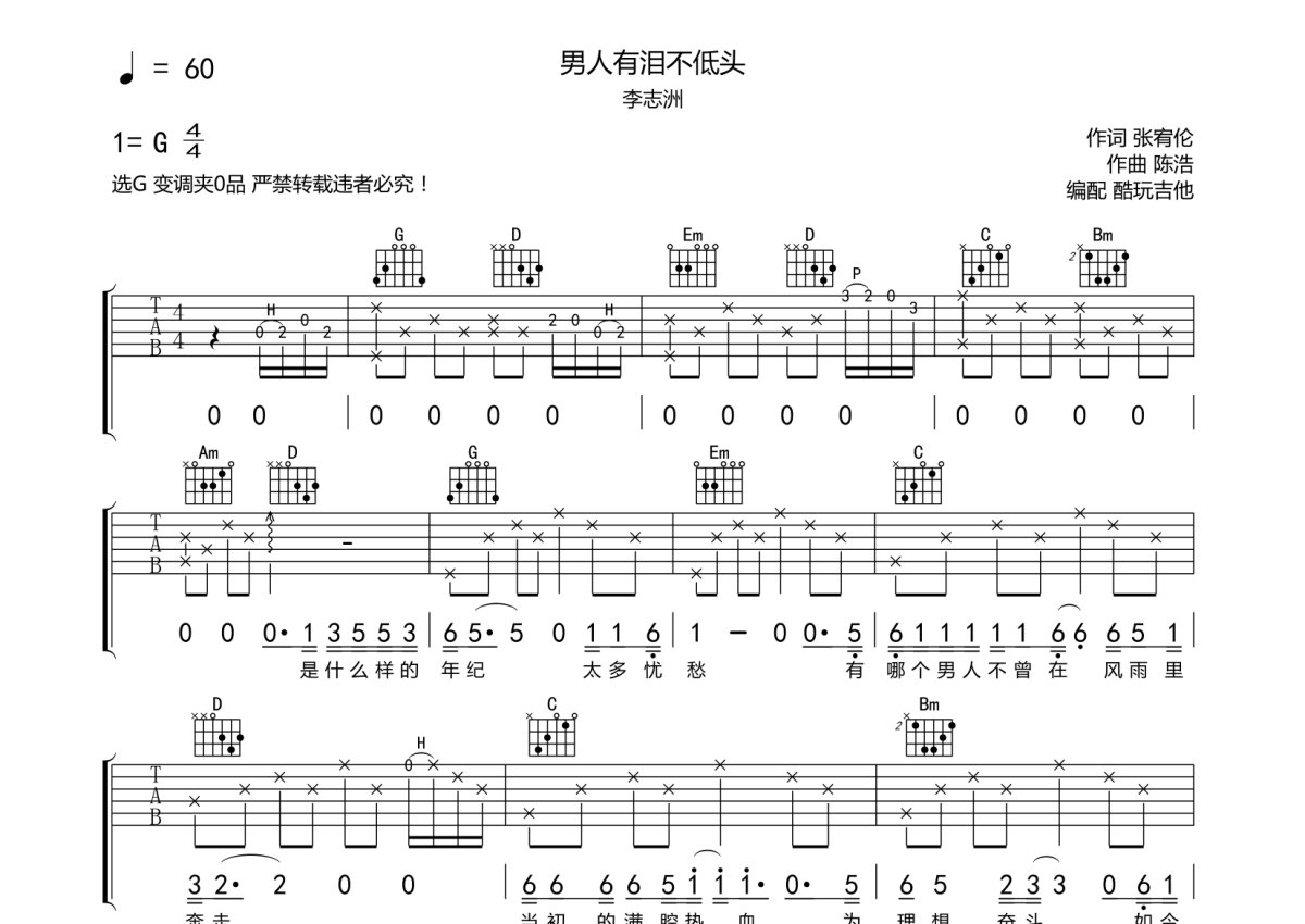 李志洲《男人有泪不低头》吉他谱 - G调弹唱六线谱