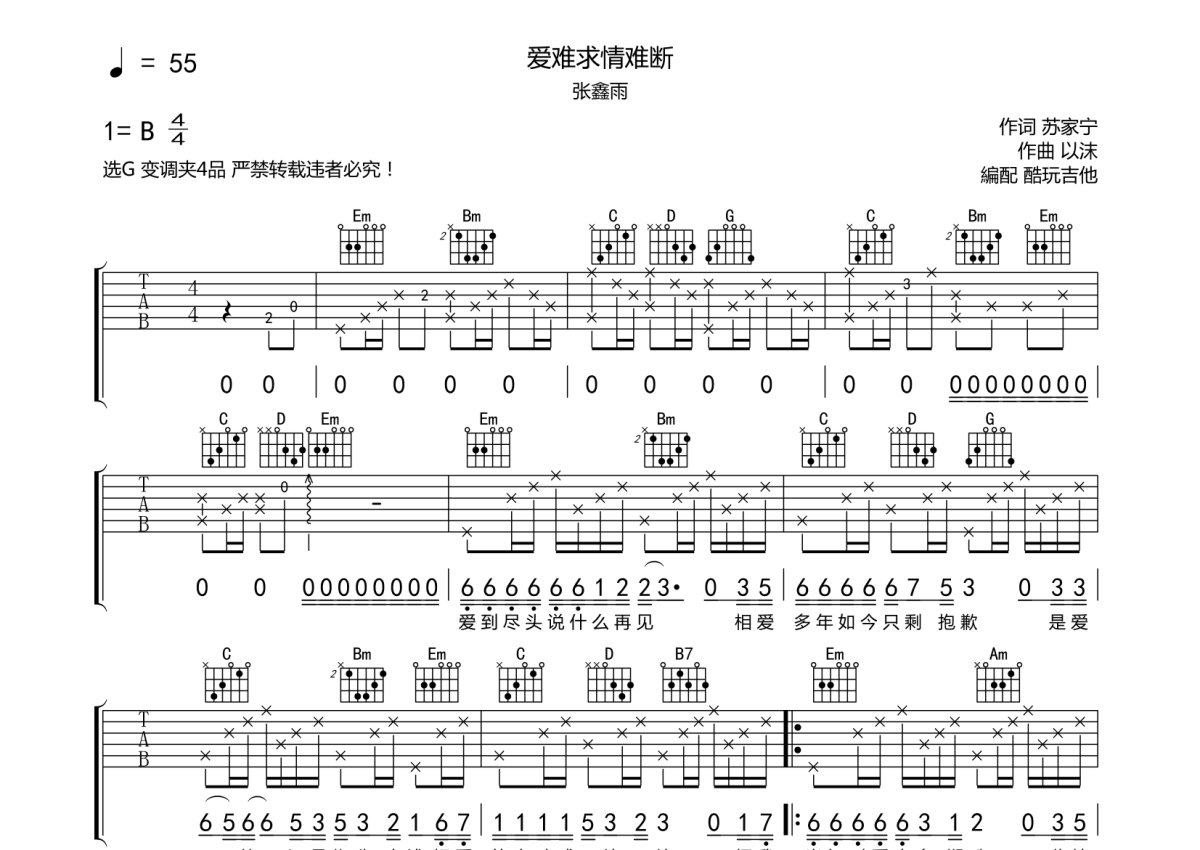 张鑫雨《爱难求情难断》吉他谱 - G调弹唱六线谱