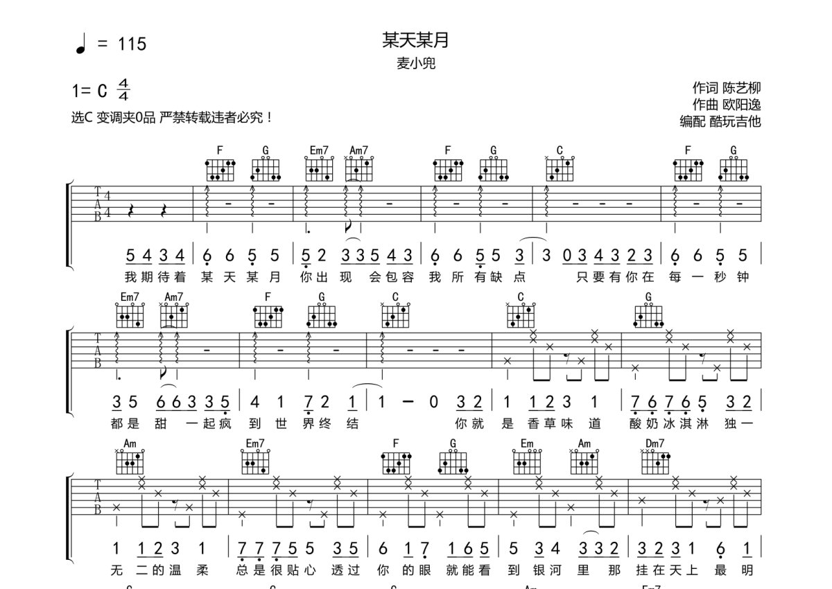 麦小兜《某天某月》吉他谱 - C调弹唱六线谱