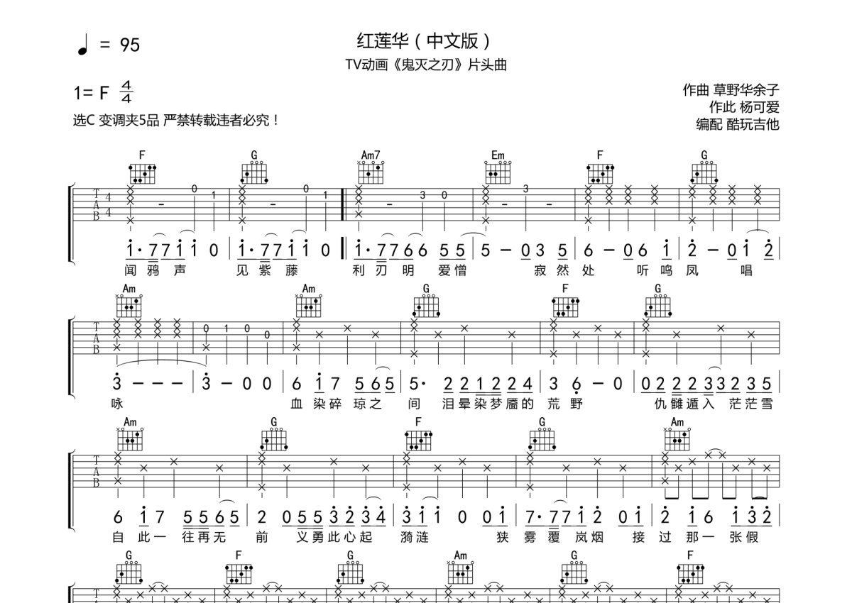 鬼灭之刃片头曲《红莲华》吉他谱 - C调弹唱六线谱