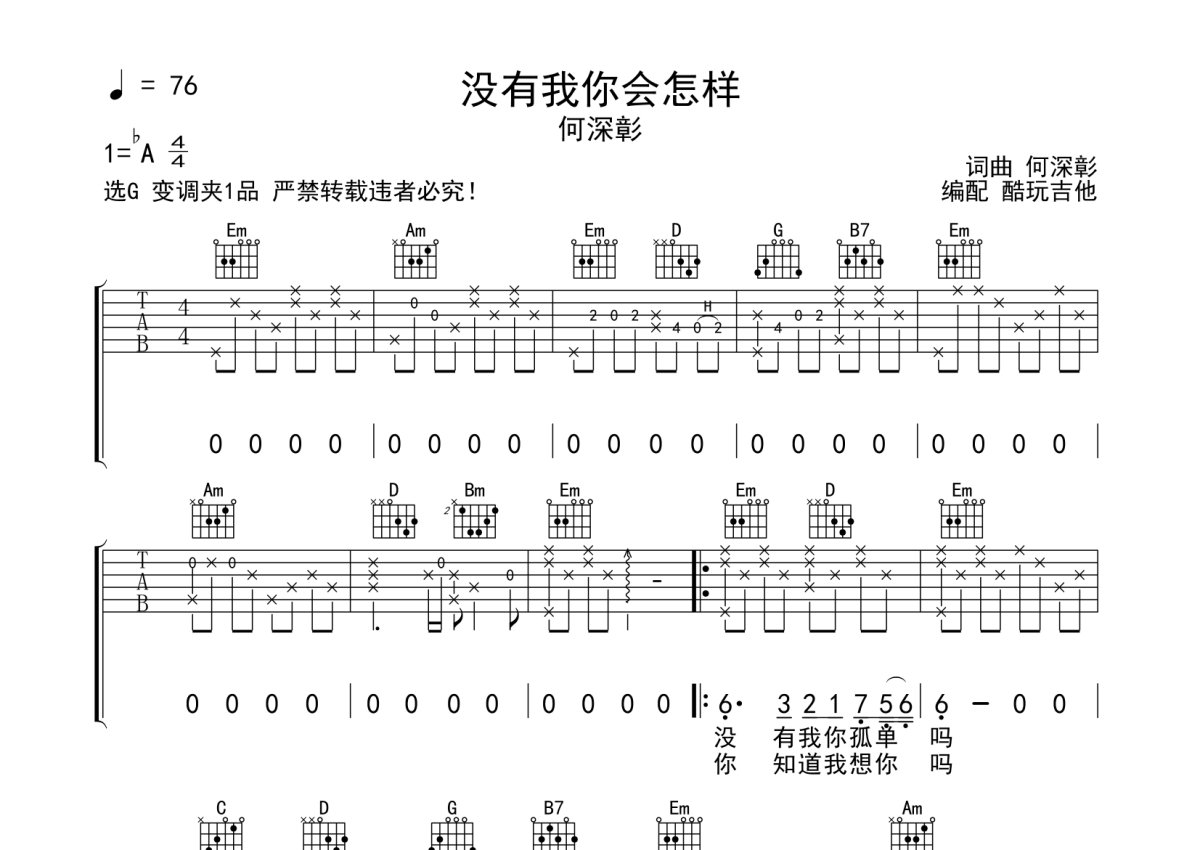 何深彰《没有我你会怎样》吉他谱 - G调弹唱六线谱