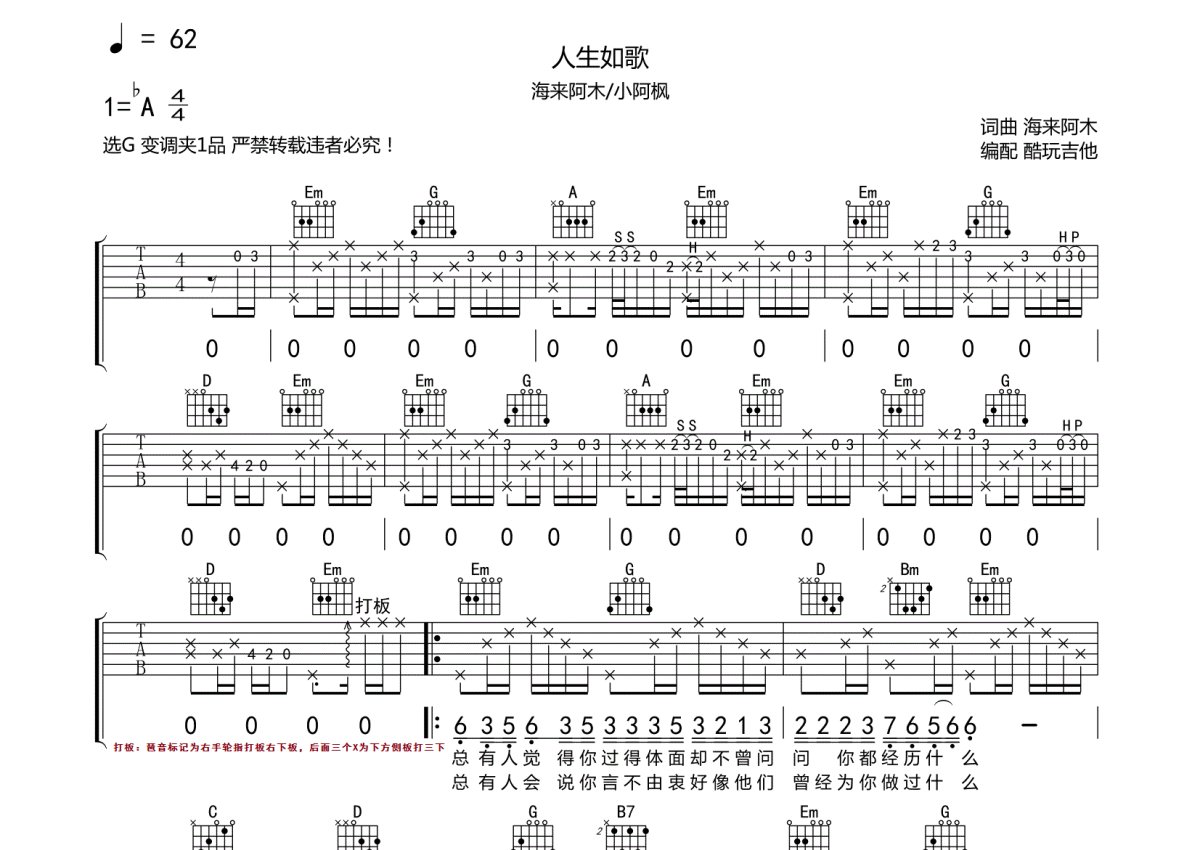 海来阿木/小阿枫《人生如歌》吉他谱 - G调弹唱六线谱