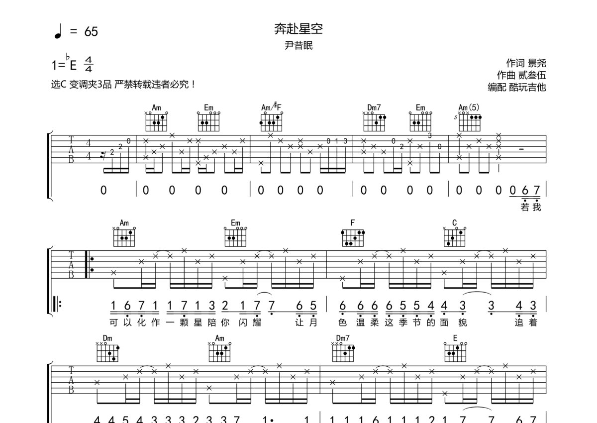 尹昔眠《奔赴星空》吉他谱 - C调弹唱六线谱