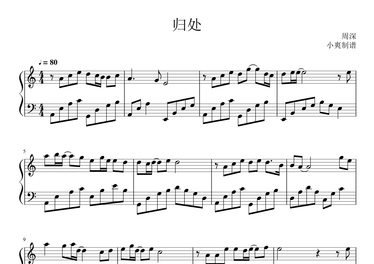 《归处》是周深演唱的一首歌曲,这份钢琴谱共有三张高清图谱,图谱由 @酷玩吉他 编配上传,曲谱配备了相关的音频提供试听,使用这份归处钢琴谱,可以让你更加方便地掌握这首歌曲的演奏技巧,快来尝试吧。周深《归处》钢琴谱。