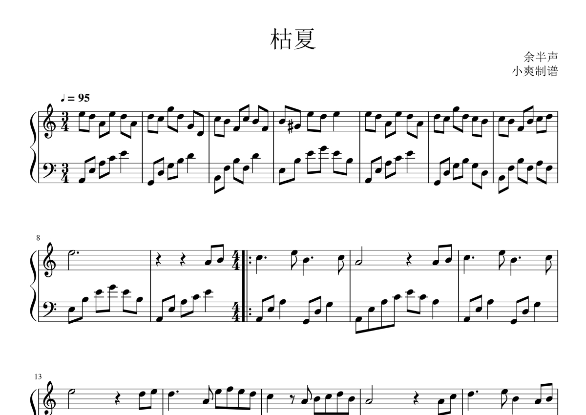 《枯夏》是余半声演唱的一首歌曲,这份钢琴谱共有两张高清图谱,图谱由 @酷玩吉他 编配上传,曲谱配备了相关的音频提供试听,使用这份枯夏钢琴谱,可以让你更加方便地掌握这首歌曲的演奏技巧,快来尝试吧。余半声《枯夏》钢琴谱。