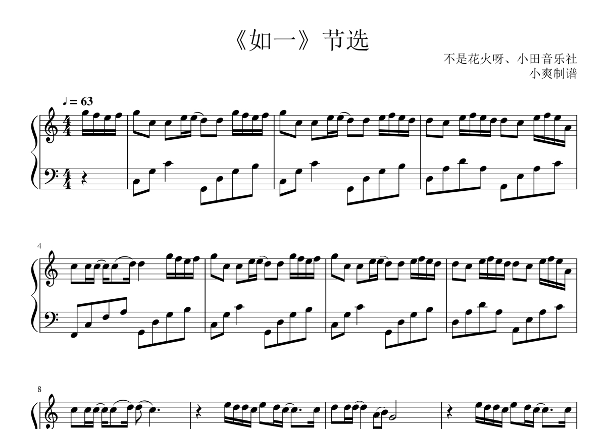 不是花火呀、小田音乐社《如一》钢琴谱