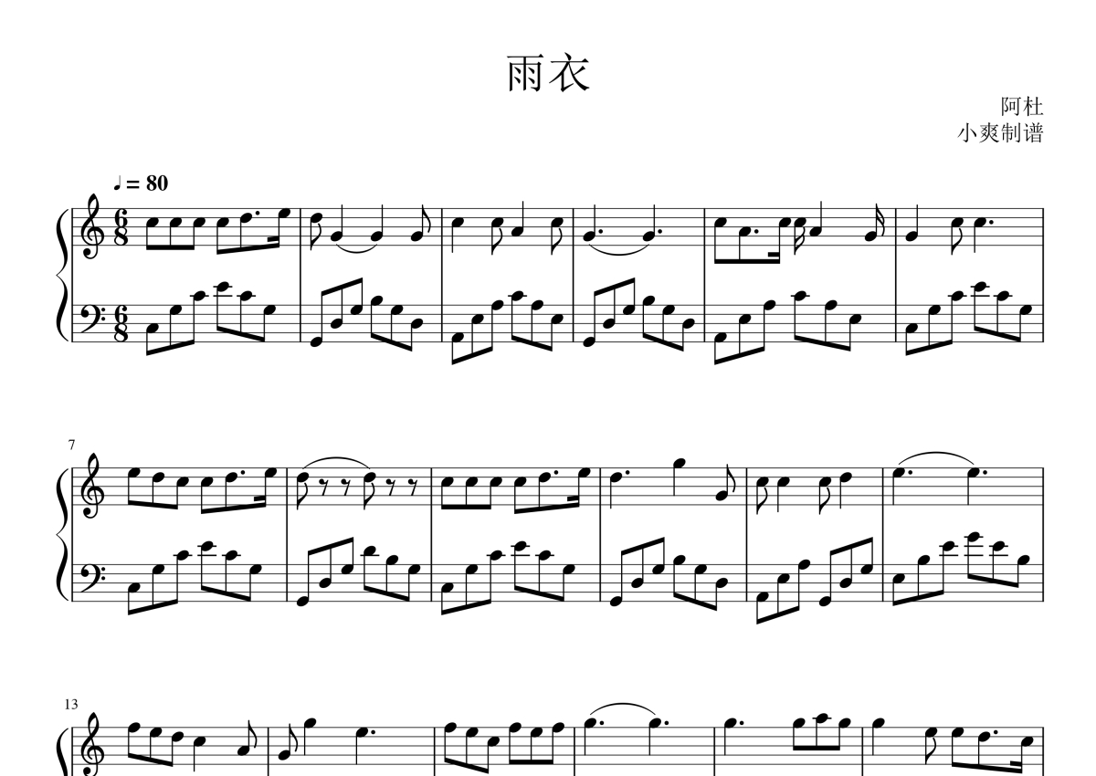 《雨衣》是阿杜演唱的一首歌曲,这份钢琴谱共有两张高清图谱,图谱由 @酷玩吉他 编配上传,曲谱配备了相关的音频提供试听,使用这份雨衣钢琴谱,可以让你更加方便地掌握这首歌曲的演奏技巧,快来尝试吧。阿杜《雨衣》钢琴谱。