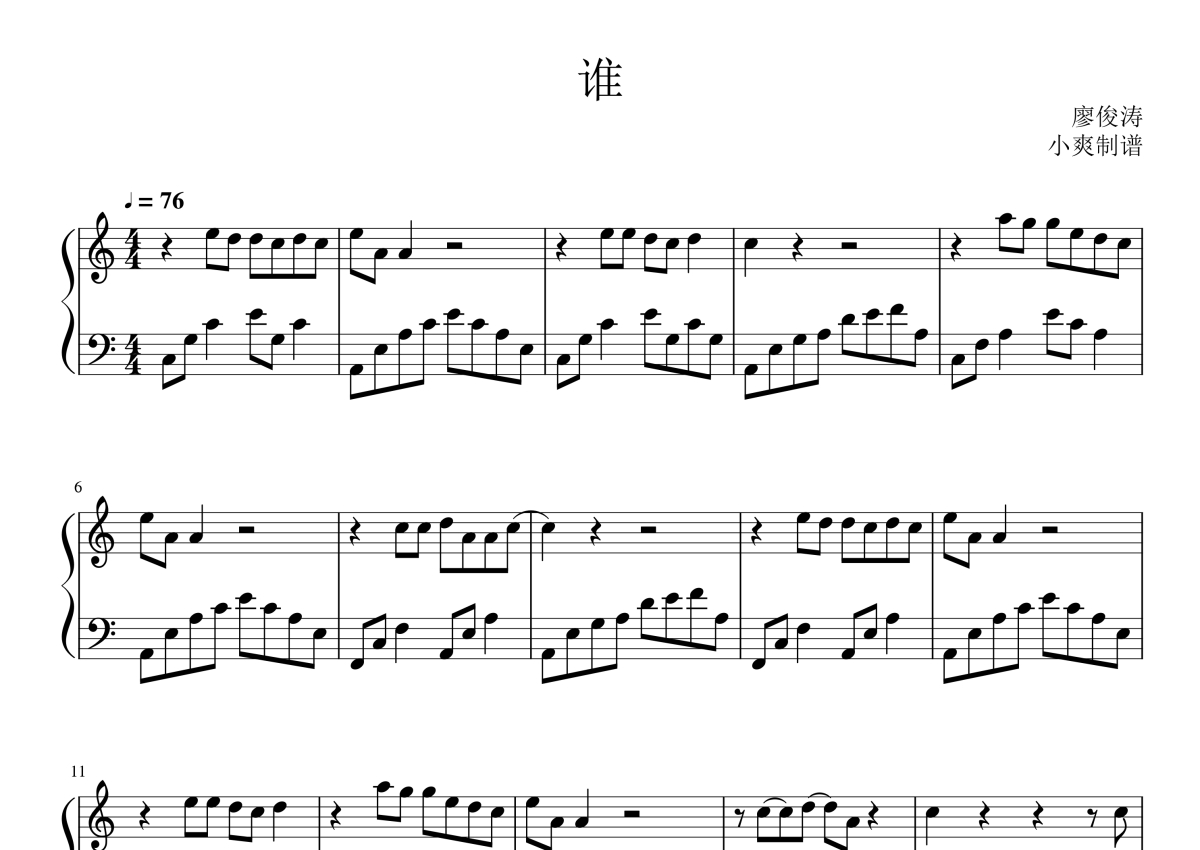 《谁》是廖俊涛演唱的一首歌曲,这份钢琴谱共有两张高清图谱,图谱由 @酷玩吉他 编配上传,曲谱配备了相关的音频提供试听,使用这份谁钢琴谱,可以让你更加方便地掌握这首歌曲的演奏技巧,快来尝试吧。廖俊涛《谁》钢琴谱。
