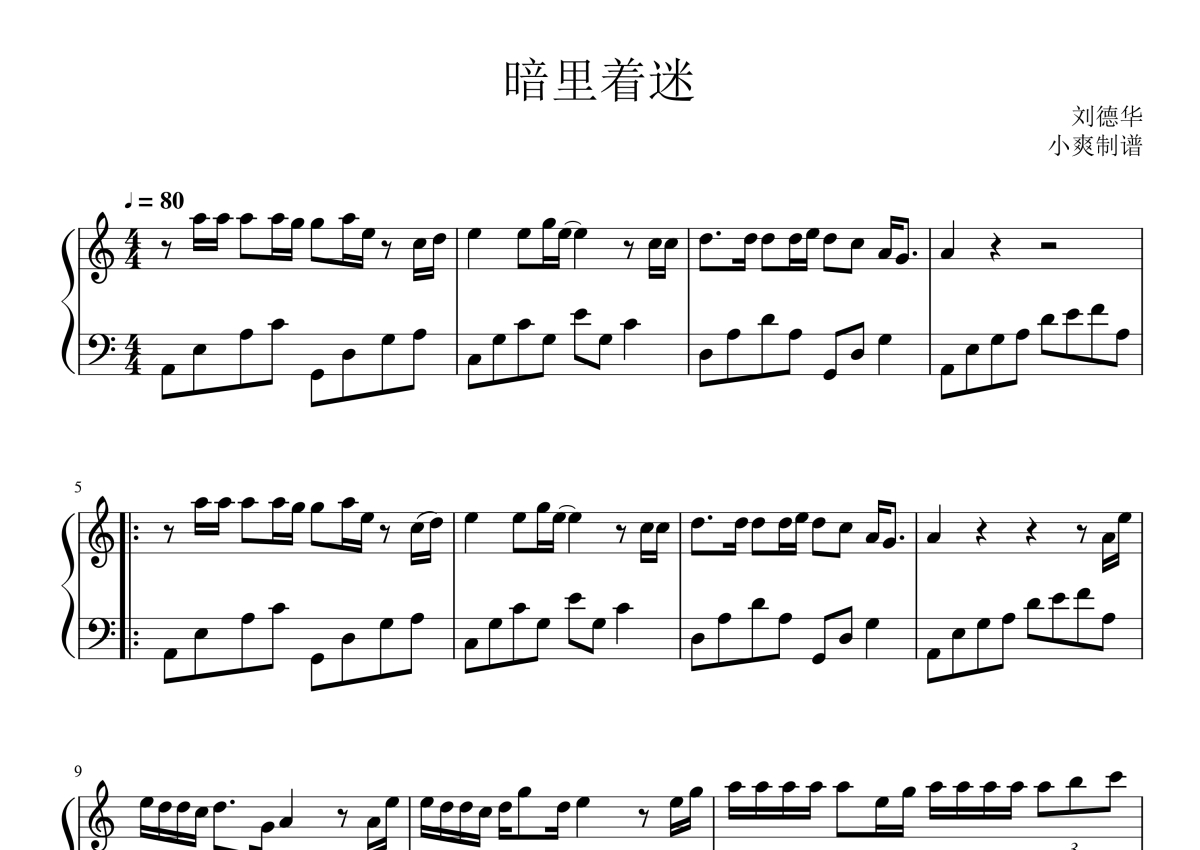 《暗里着迷》是刘德华演唱的一首歌曲,这份钢琴谱共有两张高清图谱,图谱由 @酷玩吉他 编配上传,曲谱配备了相关的音频提供试听,使用这份暗里着迷钢琴谱,可以让你更加方便地掌握这首歌曲的演奏技巧,快来尝试吧。刘德华《暗里着迷》钢琴谱。