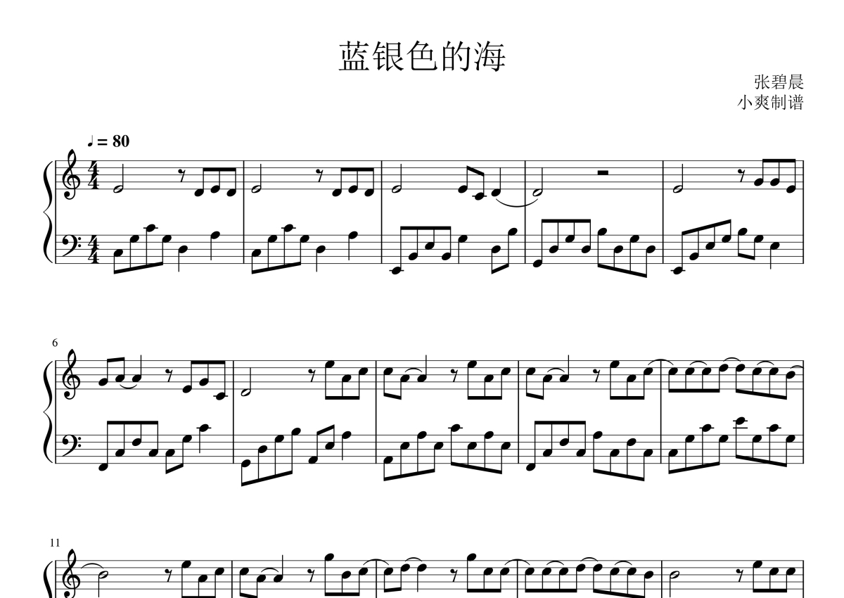 张碧晨《蓝银色的海》钢琴谱