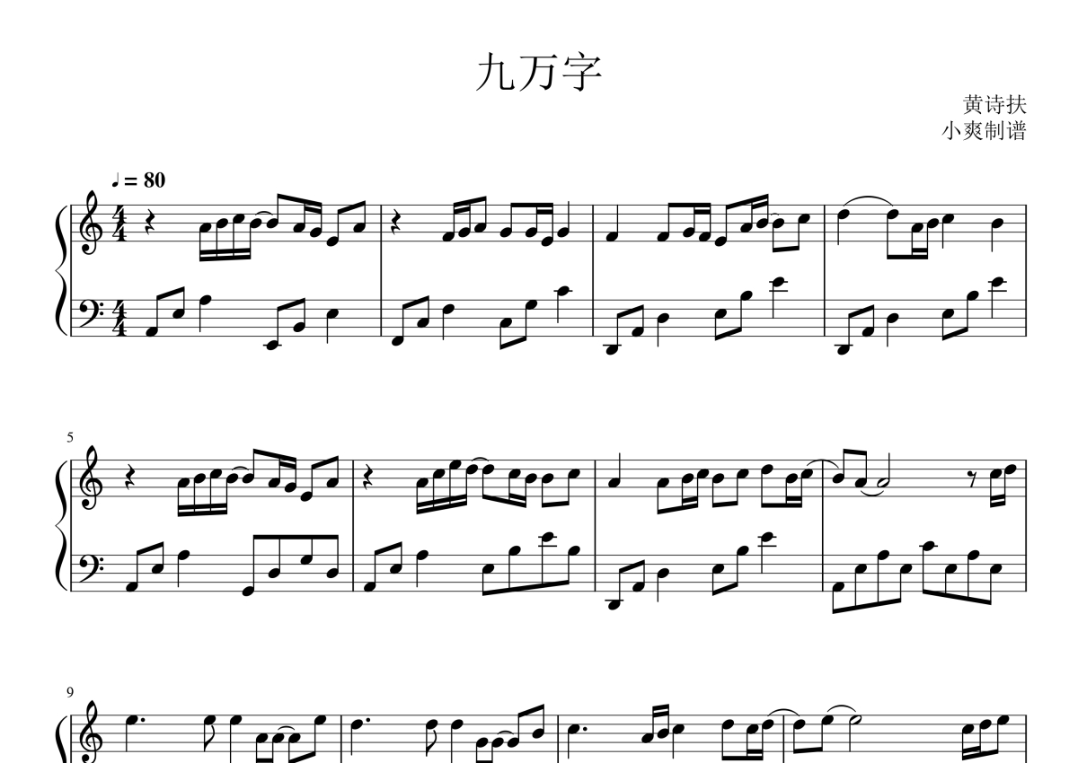 《九万字》是黄诗扶演唱的一首歌曲,这份钢琴谱共有两张高清图谱,图谱由 @酷玩吉他 编配上传,曲谱配备了相关的音频提供试听,使用这份九万字钢琴谱,可以让你更加方便地掌握这首歌曲的演奏技巧,快来尝试吧。黄诗扶《九万字》钢琴谱。