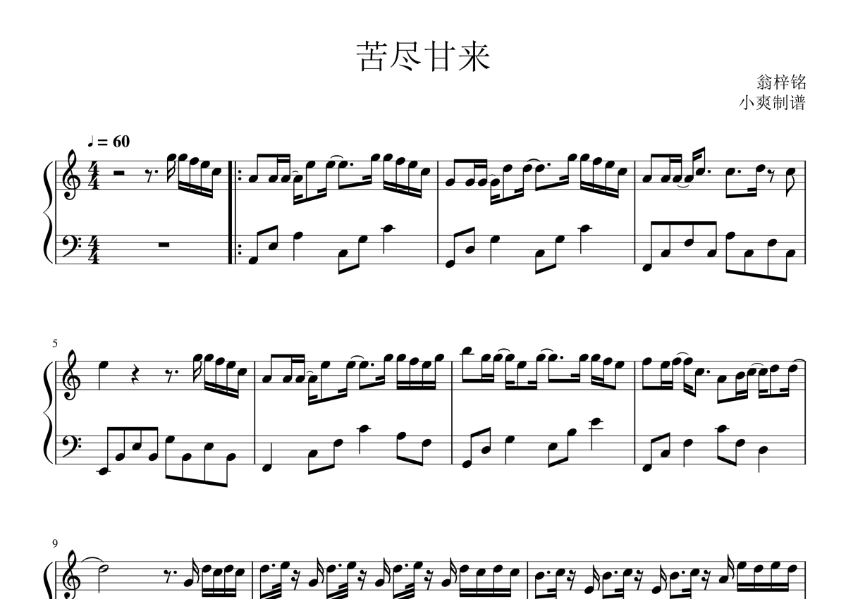 翁梓铭《苦尽甘来》钢琴谱