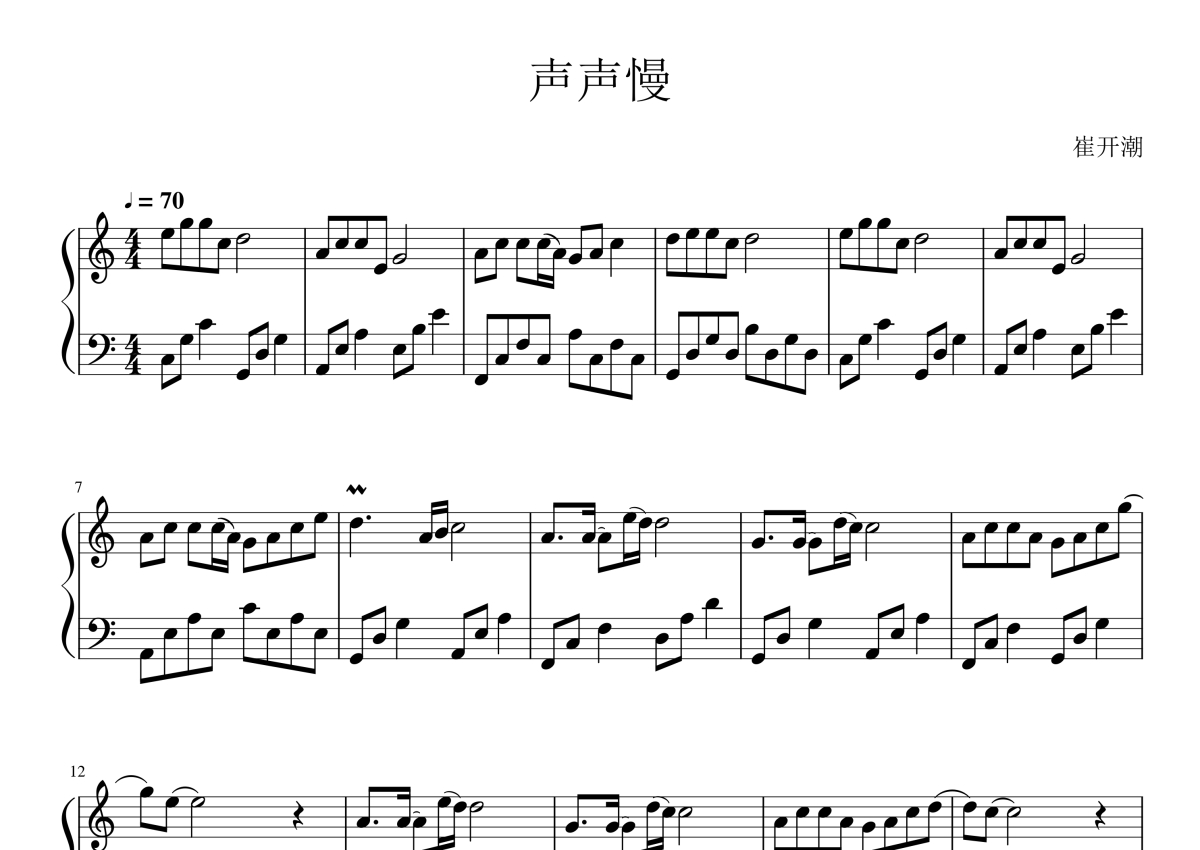 《声声慢》是崔开潮演唱的一首歌曲,这份钢琴谱共有一张高清图谱,图谱由 @酷玩吉他 编配上传,曲谱配备了相关的音频提供试听,使用这份声声慢钢琴谱,可以让你更加方便地掌握这首歌曲的演奏技巧,快来尝试吧。崔开潮《声声慢》钢琴谱。