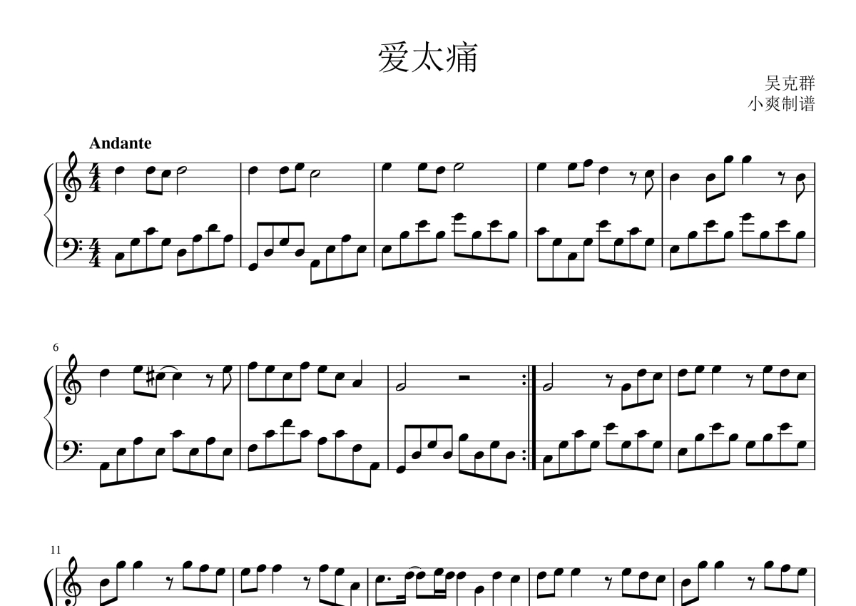 《爱太痛》是吴克群演唱的一首歌曲,这份钢琴谱共有两张高清图谱,图谱由 @酷玩吉他 编配上传,曲谱配备了相关的音频提供试听,使用这份爱太痛钢琴谱,可以让你更加方便地掌握这首歌曲的演奏技巧,快来尝试吧。吴克群《爱太痛》钢琴谱。