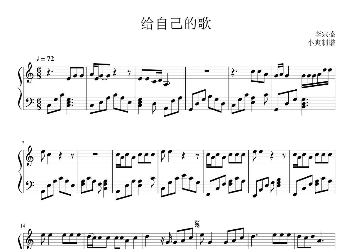 《给自己的歌》是李宗盛演唱的一首歌曲,这份钢琴谱共有三张高清图谱,图谱由 @酷玩吉他 编配上传,曲谱配备了相关的音频提供试听,使用这份给自己的歌钢琴谱,可以让你更加方便地掌握这首歌曲的演奏技巧,快来尝试吧。李宗盛《给自己的歌》钢琴谱。