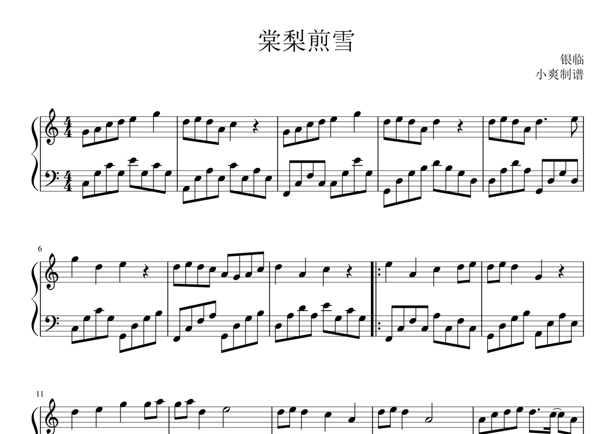 《棠梨煎雪》是银临演唱的一首歌曲,这份钢琴谱共有两张高清图谱,图谱由 @酷玩吉他 编配上传,使用这份棠梨煎雪钢琴谱,可以让你更加方便地掌握这首歌曲的演奏技巧,快来尝试吧。银临《棠梨煎雪》钢琴谱。